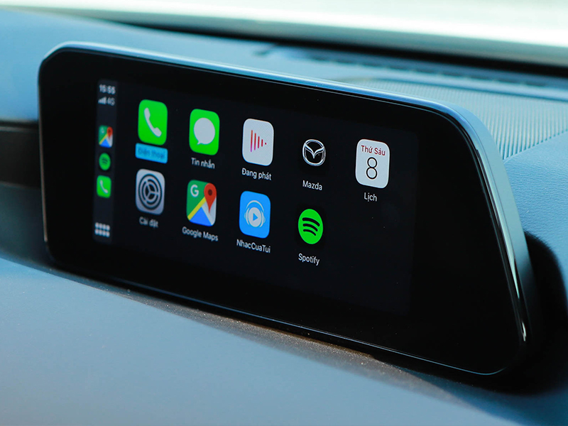 Mazda3 trang bị màn hình giải trí cảm ứng kích thước 8,8 inch được đặt dọc hướng về người lái, kết nối đầy đủ AUX, USB, Apple CarPlay, Android Auto...